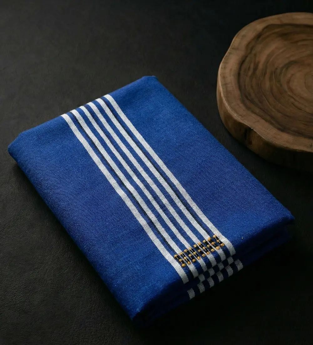 Majestueux et profond, le Faso Dan Fani Simi enveloppe le regard dans un bleu royal intense, traversé par un motif vertical de lignes blanches épurées. La composition se distingue par ses détails raffinés : des touches dorées et argentées qui ponctuent l’extrémité des bandes blanches, créant un jeu de lumière précieux et élégant.