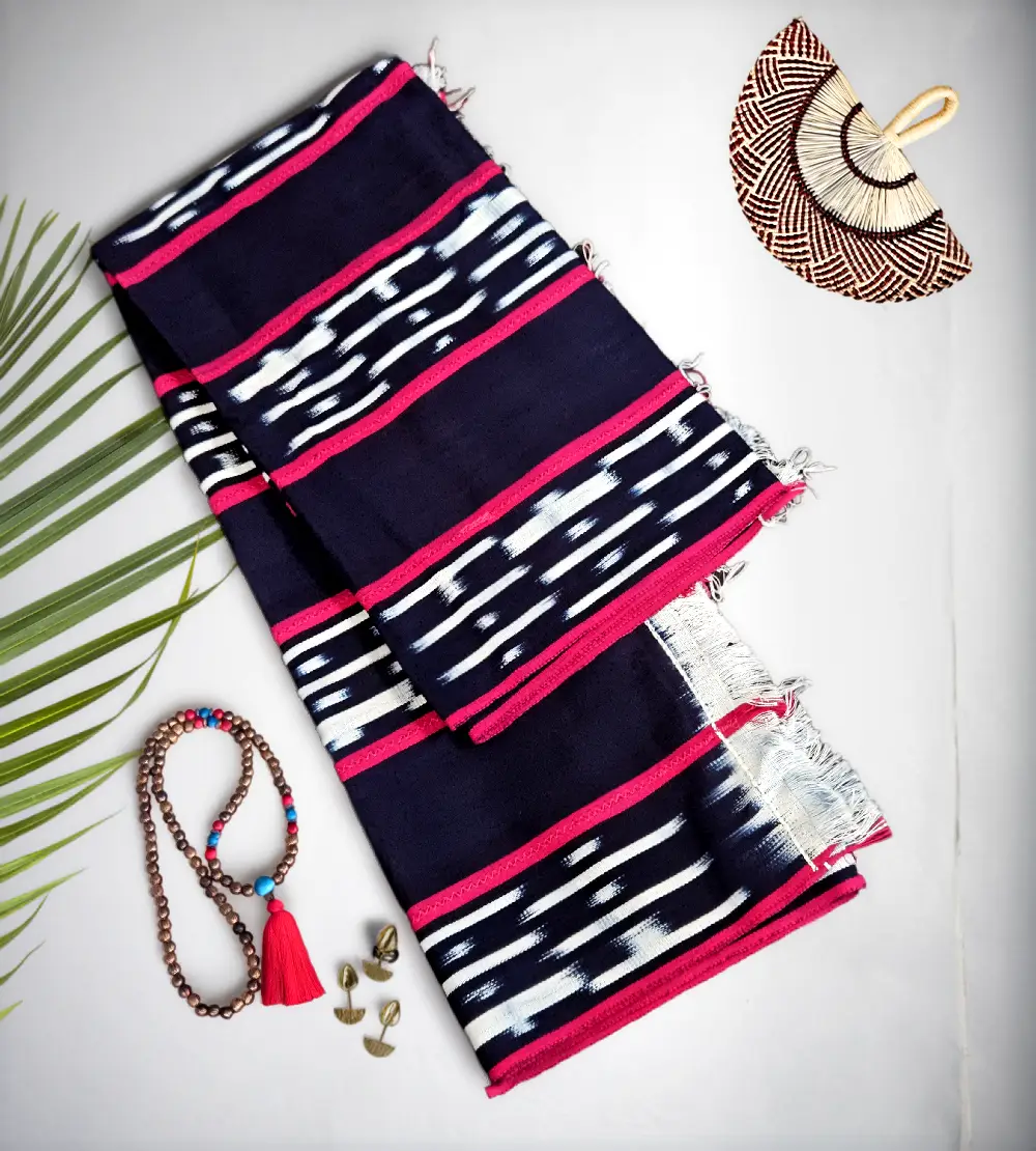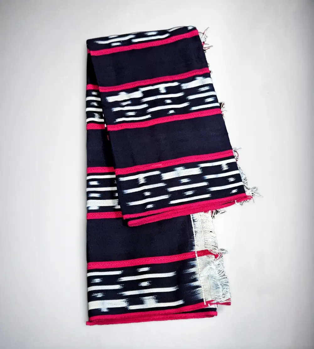Le pagne Baoulé Amoin joue le contraste d’une base marine ponctuée de réserves claires et rythmée par des bandes fuchsia. Les zones « floutées » proviennent d’une teinture par réserves : certains fils sont ligaturés/protégés avant teinture, puis tissés sur métier traditionnel. Résultat : une étoffe au toucher dense et à la tenue naturelle, idéale pour la mode et la décoration.